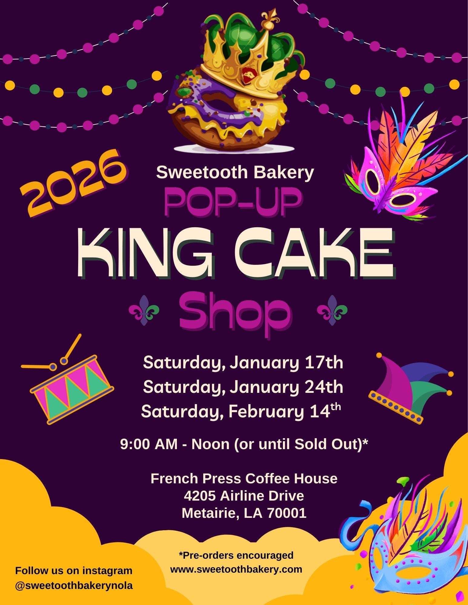 For a limited time only, we will offer King Cake Pre-Orders for pick-up ONLY during our local pop-up events. (no shipping or delivery service offered at this time).